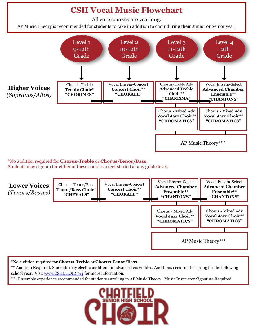 Incoming Chatfield Chargers who would like more information about choir should check out our flowchart below and our performing arts brochure! We are so excited to welcome new chargers into our program! Remember it IS possible to sign up for choir while in athletics or other activities. Students can be involved in more than one performing arts ensemble and can inquire about auditioning for advanced ensembles!